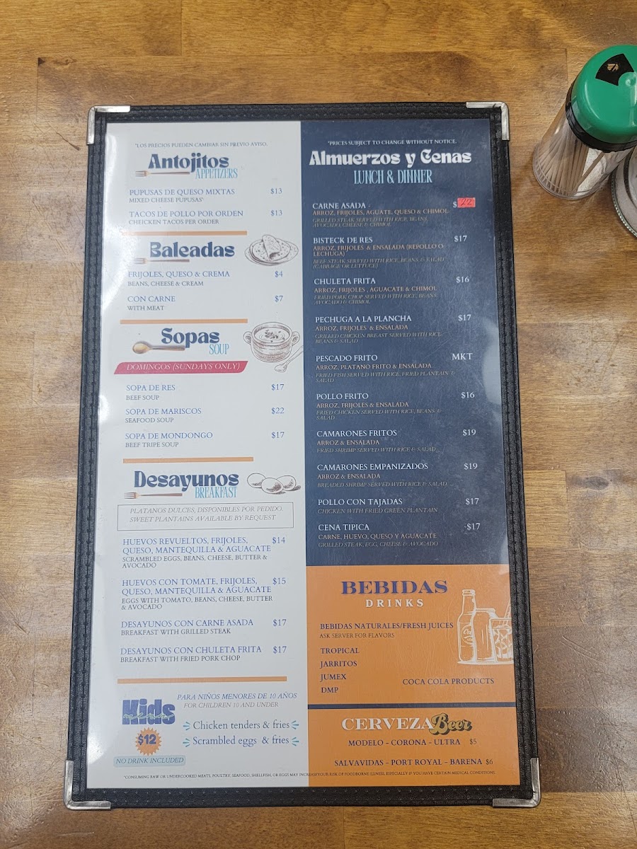 For lunch and dinner, diners can enjoy a selection of classic dishes such as the crispy Camarones Fritos / Fried Shrimp, tender Bistec De Res / Beef Steak, and flavorful Pechuga A La Plancha / Grilled Chicken Breast. Other standout choices include the savory Carne Asada / Grilled Steak and the delicious Pollo Con Tajadas / Chicken With Fried Green Plantain. Each dish offers a taste of authentic flavors, served fresh and well-prepared.